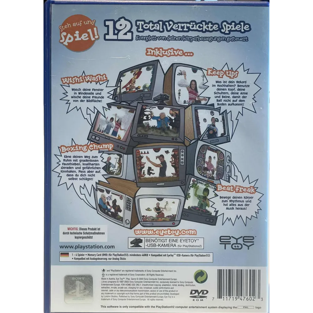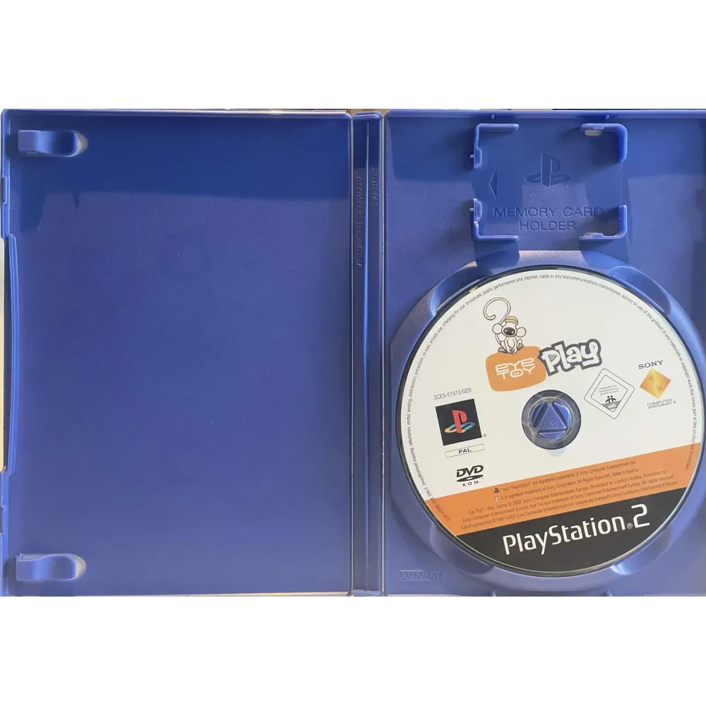 EyeToy Play ble lansert i 2003 og utviklet av London Studio (Sony). Spillet krever EyeToy-kameraet koblet til PS2 og tilbyr en rekke minispill som responderer på spillerens bevegelser foran kameraet. Spillene kan inkludere å klappe, vifte med hender, hoppe eller bevege seg raskt for å fullføre små utfordringer. Det er primært et party-spill med fokus på moro og bevegelse, ikke tradisjonell kontroll. PS2-versjonen har vanligvis én spiller (med kamera) og flere minispill. Denne utgaven er en PAL-versjon, vanlig “Play”-versjon (ikke samling eller spesialutgave).