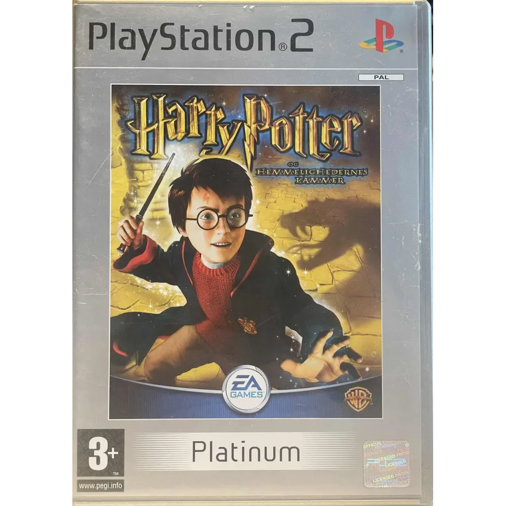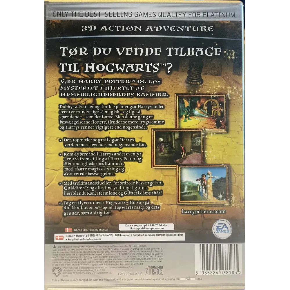 Harry Potter og Hemmelighedernes Kammer (Chamber of Secrets) kom opprinnelig i 2002 som action-eventyrspill fra EA og Eurocom for flere plattformer. PS2-versjonen ble senere lansert som Platinum 9. juli 2004, etter å ha nådd høyt salgstall i Europa. Spilleren styrer Harry Potter gjennom hans andre skoleår, lærer nye trylleformularer, løser gåter, utforsker slott og leger mot monstre fra den fryktelige Kammerets hemmeligheter. PS2-versjonen er utelukkende singleplayer — ingen flerspillermodus — og fokuserer på historie, puslerier og kampmekanikk. Denne Platinum-utgaven er samme innhold som originalen, men i “sølv-cover” slik som var vanlig for suksessrike spill i Platinum / Greatest Hits-serien.