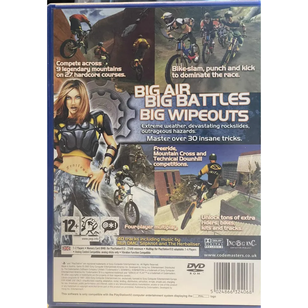 Downhill Domination ble utviklet av Incognito Entertainment og utgitt av Codemasters i 2003. Spillet kombinerer høyhastighets terrengsykling med action og stunts i bratte fjellandskap. Spilleren konkurrerer mot datamotstandere eller venner i flerspiller-modus via delt skjerm.