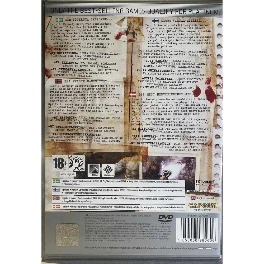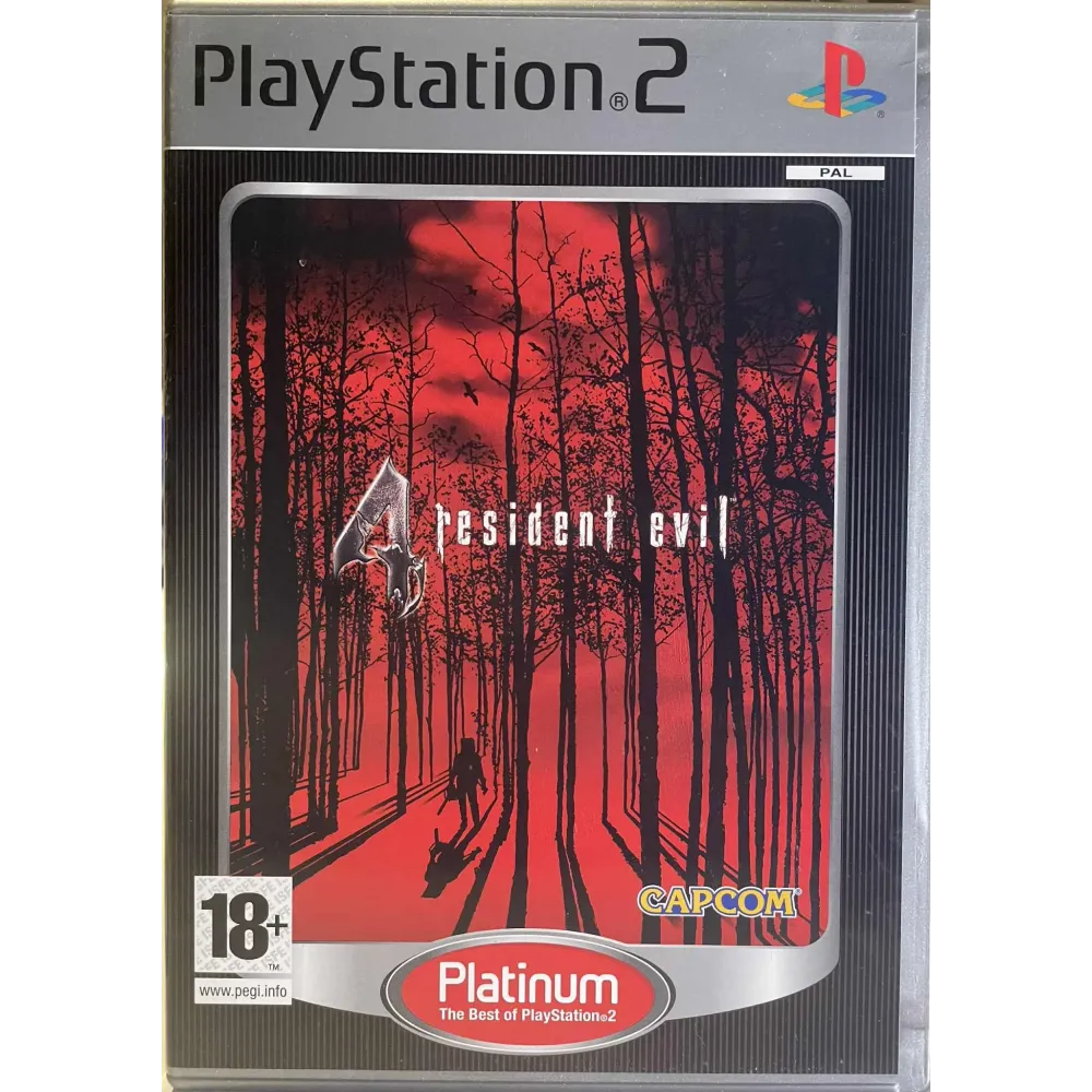 Dette er Resident Evil 4 i PAL-versjon (Europa) med “Platinum” dekor – en budsjett-/best-of utgave med sølvramme. Spillet følger Leon på et misjonsoppdrag i en isolert landsby i Europa, der han må bekjempe infiserte fiender og redde presidentens datter. Spillet introduserte en mer actionfokusert stil til Resident Evil-serien, med over skulder-kamera, presisjonsskyting og dynamiske fiender.