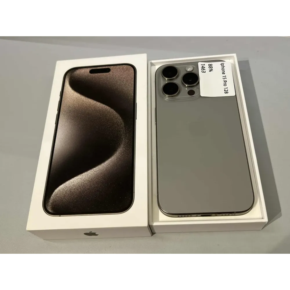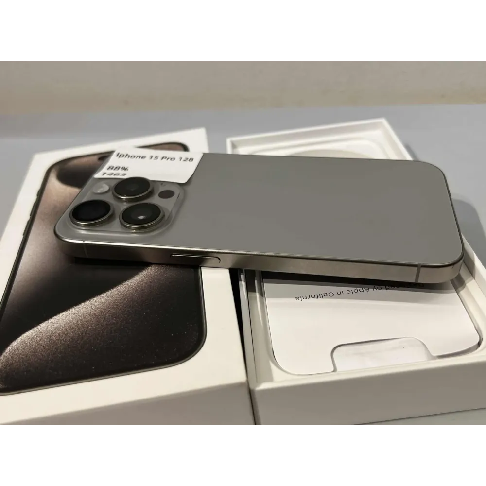 Lekker iPhone 15 Pro i fargen Natural Titanium, med 128 GB lagring og 88 % batterikapasitet.