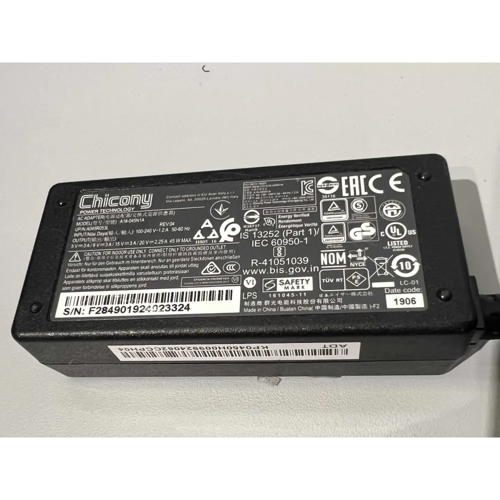 Dette er en original Acer 45 W USB-C strømforsyning, modell A16-045N1A, produsert av Chicony Power Technology Co., Ltd.
