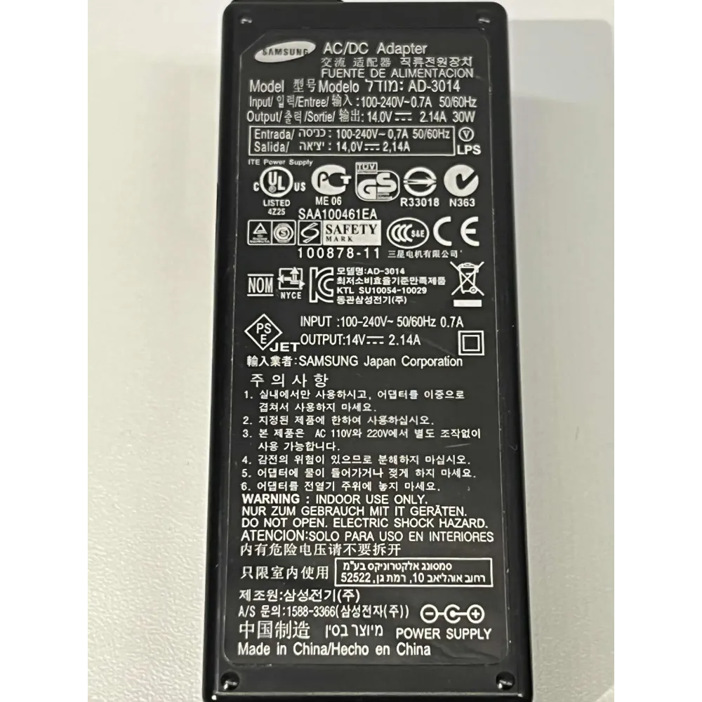 Dette er en original Samsung AD-3014 strømforsyning på 14 V / 2.14 A – tilsvarende 30 W effekt.
