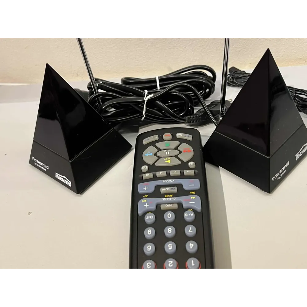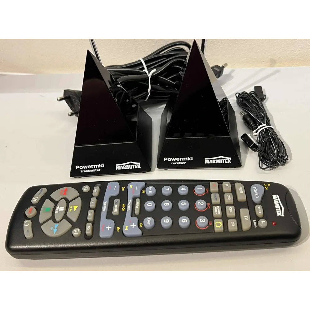 Settet inkluderer også en original Marmitek-fjernkontroll som kan programmeres til flere enheter (TV, DVD, CD, SAT, VCR m.m.).