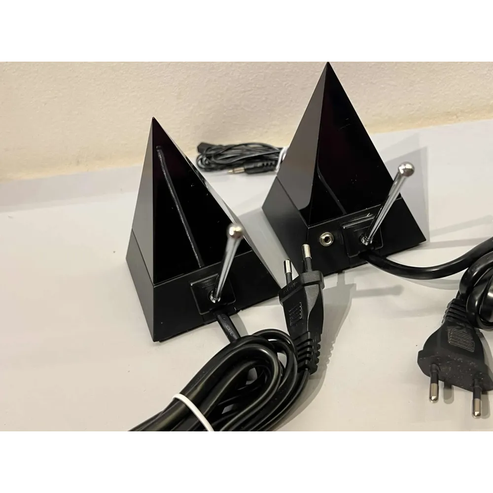 Marmitek Powermid består av en sender og en mottaker formet som sorte pyramider.